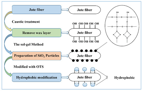The hydrophobic and lipophilic processes of jute fiber fabrication are described in Figure 1. In this study, caustic pretreatment is done to remove the layer of plant fiber wax, to expose more hydroxyls, and to improve the interface bonding properties. TEOS hydrolyzes as SiO2 particles and adheres to the surface of the material via a chemical effect. Finally, the material is immersed in OTS/n-hexane solution. Since the silica surface is coated with silane, the long-chain hydrophobic alkyls are introduced onto the jute fiber surface; this makes the fiber resistant to wetting by water droplets [8,23].