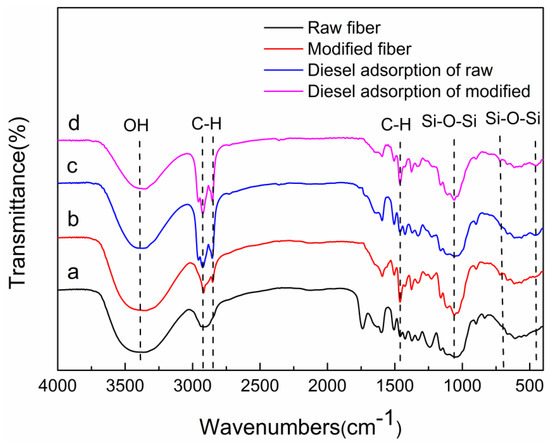 The FTIR spectra of raw and modified jute fibers are shown in Figure 2. Compared with the peak of the raw jute fiber, that of modified jute fiber at 470 cm−1 and the new absorption peaks at 798 and 1112 cm−1 are markedly strengthened; these correspond to Si–O–Si bending, indicating that SiO2 has adhered to the jute fiber surface [8,24,25]. The vibration of –C–H (–CH2 and –CH3) groups are observed at 1430, 2920, and 2855 cm−1. This indicates that OTS and jute have been successfully bonded [26,27]. The peaks at 3430 cm−1 are attributed to –OH stretching vibrations [8,28]. After diesel adsorption, there are no new groups generated, indicating that the adsorption of diesel onto fibers is not through chemical bonding, physical adsorption is dominant [29].