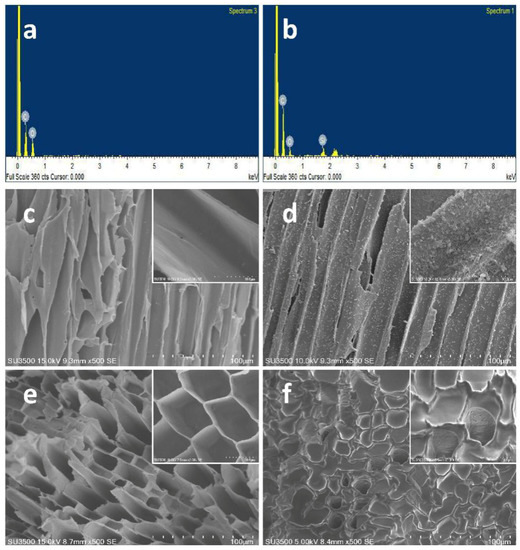 The chemical compositions of raw and modified jute were characterized by EDS, as shown in Figure 3a,b. The EDS spectrum of raw jute shows the presence of the elements C and O (Figure 3a). In case of the fibers modified with SiO2 and OTS, the peak for Si can also be observed along with those for C and O (Figure 3b). This result reveals that raw fiber is modified successfully with SiO2 and OTS. In order to further study the morphological changes after modification, raw and modified fiber were analyzed by SEM (results are displayed in Figure 3c,d). The results prove that the surface of the raw fiber is relatively smooth (Figure 3c). The magnified image of the fiber also shows a smooth surface of the raw fiber. After coating with SiO2 particles and modification with OTS, the surface becomes much rougher than that of the raw fiber (Figure 3d). The magnified image displays more clearly the dispersion and morphology of SiO2 particles on the surface fiber at higher magnification. The jute fiber has a smooth structure, a thin fiber wall, and a clear porous structure (Figure 3e) before diesel adsorption. After adsorbing, a thick oil film is attached to the surface of the fiber, and oil is also attached to the internal fiber walls of the gap. As a result, the entire fiber wall becomes thicker and most of the porous structure is blocked (Figure 3f) [29].