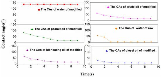 Figure 4 shows that CAs of different liquids change on the fiber surfaces. All of the oil CAs after modification are less than 20° when they reach stable states. According to Young’s equation [32], the modified jute fiber has better wettability for different oils and water CAs of up to 136.2° indicate high hydrophobicity. Because the CA of the water drop on the surface of the raw fibers is too small to be determined by the CA goniometer, the wetted area has to be measured. Therefore, the effective CA is obtained on the basis of the spherical cap. The wetted area of a 3 μL drop is about 20 mm2; therefore its CA is about 5° [33].