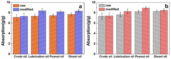 As shown in Table 2, the adsorption capacity of raw and modified fibers approach the maximum value in 15 min, increasing slowly thereafter. After 40 min, the oil and water adsorbed in the fiber lumen reach maximum saturation. After 24 h, adsorption is almost unchanged as compared with that at 40 min. The rapid water adsorption of jute fiber decreases from 6.37 ± 0.06 g/g (raw) to 0.55 ± 0.04 g/g (modified), and the saturated water adsorption decreases from 8.53 ± 0.03 g/g to 0.92 ± 0.02 g/g, indicating excellent hydrophobicity. For the raw jute fiber, the rapid adsorption capacities for crude oil, lubricating oil, peanut oil, and diesel oil are 7.12 ± 0.05 g/g, 7.36 ± 0.04 g/g, 7.45 ± 0.06 g/g, and 7.50 ± 0.02 g/g, respectively. The adsorption rate of the modified fiber increases by 1.03, 1.14, 1.1, and 1.11 times, respectively (Figure 5a). On the other hand, the saturated adsorptions are 7.33 ± 0.07 g/g, 9.53 ± 0.05 g/g, 8.24 ± 0.04 g/g, and 8.38 ± 0.05 g/g, respectively. After modification, they are 7.41 ± 0.03 g/g, 10.29 ± 0.04 g/g, 8.94 ± 0.02 g/g, and 8.48 ± 0.04 g/g, respectively (Figure 5b). Hydrophobicity increases greatly after modification of the raw fiber, and lipophilicity has a certain degree of improvement. All representative results are in g/g (g (liquid)/g (sorbent)).