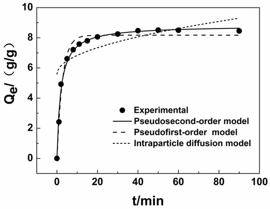 An example of the adsorption kinetics curve for the modified jute (diesel adsorption) is shown in Figure 6. The adsorption rate reflects the amount of modified jute in the oil–water system per unit time. The slope at each point represents the instantaneous adsorption rate. The amount of adsorption increases rapidly (in 8 min). The amount adsorbed increases slowly from 8 to 40 min, and the adsorption equilibrium is reached after 40 min. The reason for this phenomenon is attributed to the large number of internal pores in the modified jute structure. Because diesel is a hydrophobic viscous material and the solubility in water is very low, the diesel can quickly adsorb onto the surface of the material through intermolecular forces. Meanwhile, the diesel is transported into the interior of the jute fiber because of capillary action. The diffusion then becomes more difficult as the pore volume within the fiber decreases, so the amount adsorbed tends to increase very slowly and finally reaches a steady state.