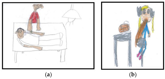 Drawings about “How I feel when I am sick” (phase 2): (a) Drawing in which the emotion of the sick child was categorized as happiness; (b) Drawing in which the emotion of the sick child was categorized as pain.