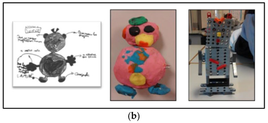 Once the needs of ill and hospitalized children had been identified, the participants in the design process had to decide what social robot they would build. This was done by defining what the robot had to do (phase 3) and specifying its appearance and functionalities (phase 4). More than obtaining information from the final social robots’ prototypes built by children (Figure 2), which were very basic, we focused on the building process.