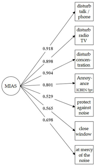 The model fit values for MIAS as assessed for railway noise (Supplementary Materials, Table S10) and road traffic (Supplementary Materials, Table S14) are, altogether, in a similar range than those for aircraft noise (Supplementary Materials, Table S7). That is, the CFA results on MIAS for railway and road traffic noise broadly confirm the satisfying construct validity of the hierarchical structure of MIAS.