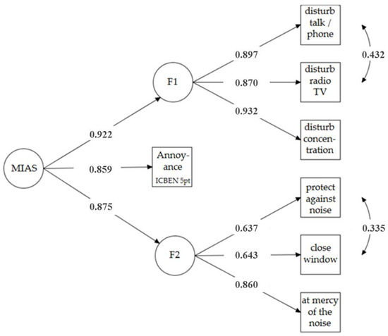 Through confirmative factor analyses (CFA), we tested two models: (A) a one-factor structure with MIAS as a factor, including items of disturbances, annoyance and the lack of capacity to cope with noise; and (B) a hierarchical structure with the second-order multiple-item noise annoyance scale (MIAS) consisting of two factors F1 (‘noise-related disturbances’), F2 (‘perceived lack of coping capacity’), and the single ICBEN five-point annoyance item.