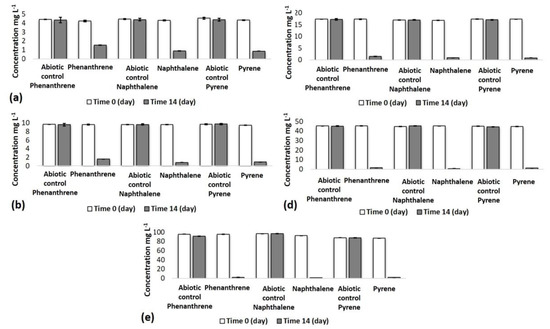 Bioremoval of polycyclic aromatic hydrocarbons by microbial consortium. (a) 5 mg L−1; (b) 10 mg L−1; (c) 20 mg L−1; (d) 50 mg L−1; (e) 100 mg L−1. The relative standard deviation (RSD) was less than 20% in all samples. Samples were analyzed in triplicate.