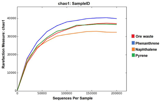 The microbial consortium showed a high removal capacity (over 90% for pyrene, naphthalene, and phenanthrene) at a concentration of 100 mg L−1 in water and after 14 days of incubation. The studied alpha indexes, Chao1, Shannon, and Simpson, show a significant diversity supported by richness and relative abundance. As presented in Table 1, Shannon values range from 6.55 to 7.71, and Simpson values range around 0.92–0.95. Among the four samples, a closer relationship is observed between the original sample and the consortium that was stabilized with phenanthrene. Both ore waste and consortium stabilized with phenanthrene and obtained the highest indexes compared to those of naphthalene and pyrene (Table 1).