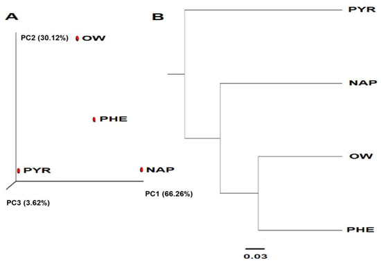 Beta diversity analysis of unweighted UniFrac distance scores. (A) PCoA plot and (B) UPGMA tree: ore waste (OW), phenanthrene (PHE), naphthalene (NAP), and pyrene (PYR).3.3. Taxonomic Category of the Identification of the Microbial Consortium Exposed to the Different PAHs through the QIIME Analysis