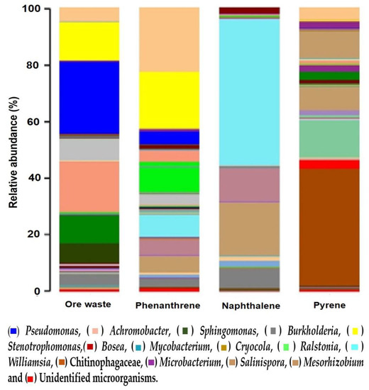 The dominant group of microorganisms identified from the microbial consortium at the phylum taxonomic level was Proteobacteria, and Actinobacteria was the dominant subgroup. It must be noted that, depending on the pollutant, the abundance of organisms changes. Pseudomonas were found to be the dominant group in the ore waste sample. The dominant group exposed to phenanthrene was Stenotrophomonas, that exposed to naphthalene was Williamsia, and that exposed to pyrene was Chitinophagaceae. These consortia can be valuable sources of bacteria for the purpose of remediation of other sites contaminated with these PAHs.