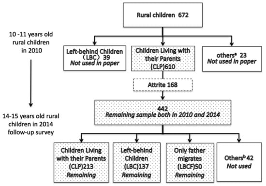 The construction of panel data. Source: CFPS (2010, 2014); a Others include: only father migrates or only mother migrates; b Others include: migrant children either with Hukou or without Hukou; c The shaded boxes show the division of the three main subgroups in our sample.