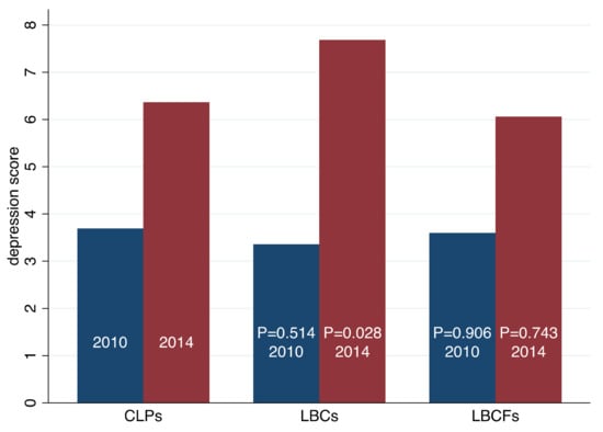 Distribution of depression score between 2010 and 2014 among three main subgroups. Source: CFPS (2010, 2014). The p-value of difference test of depression score between CLPs and LBCs’ in 2010 is 0.514. The p-value of difference test of depression score between CLPs and LBCFs’ in 2010 is 0.906. The p-value of difference test of depression score between CLPs and LBCs’ in 2014 is 0.028. The p-value of difference test of depression score between CLPs and LBCs’ in 2014 is 0.743.