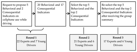 We applied the Delphi method, developed by Dalkey and Helmer in the 1950s []. The Delphi method is widely used for achieving a convergence of opinions from experts and participants with knowledge and insights on a specific topic []. To obtain the views of scientific experts, we recruited the lead or senior authors on articles or reports on cellphone use while driving published between 1 January 2011 and 31 December 2015. To obtain the opinions of young drivers, we recruited freshmen from West Virginia University (18–20 years of age). We sent an e-mail to 42 experts and 30 college freshmen soliciting their participation. Among those invited, 52% of experts (n = 22) and 23% of young drivers (n = 7) agreed to participate. The Delphi survey was conducted using the web-based survey tool, REDCap [], and consisted of three rounds (Figure 1).