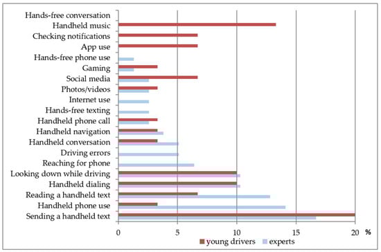 Consequential indicators of cellphone use while driving presented as a percent of total possible responses from experts and young drivers, United States, 2016.