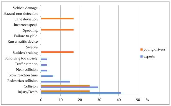 Figure 3 shows the percentage of round 3 participants who named each consequential indicator as among the two most important (out of all indicators). Injury/death and collision were most commonly selected by both experts and young drivers.