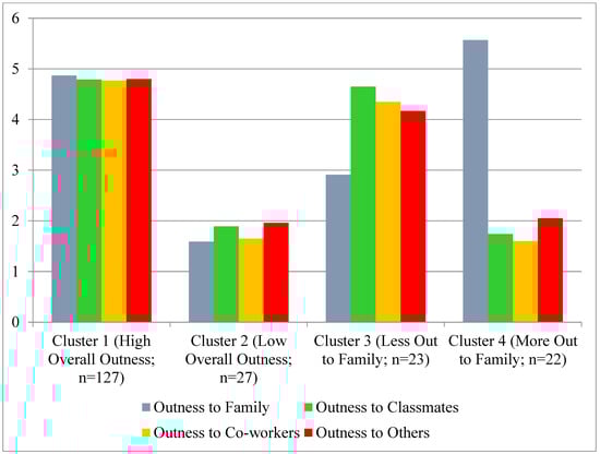 Cluster 4—More Out to Family. Cluster 4 (n = 22; 11.06% of participants) was characterized by higher outness to family (M = 4.57, SD = 0.60) than to classmates (M = 1.74, SD = 0.93), co-workers (M = 1.60, SD = 0.88), and others (M = 2.05, SD = 1.12).