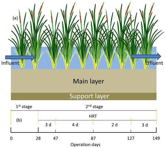 In order to initiate the biological treatment, the CWs were inoculated with a diluted activated sludge and were operated under static mode (data was not presented) for one week before shifting to a continuous operation, during which the reactors were operated in a free water mode [14]. In the start-up stage (static mode), extra carbon source was supplied so as to promote the establishment of microorganisms. In the first stage (0–28 days) of the continuous operation, an HRT of three days was adopted in order to evaluate the release of the nutrients from the straw. Then, from days 28 to 149 (2nd stage), the impact of the HRT (two days, three days, and four days) [12] on the pollutant removal was studied by changing the influent flow rate, as depicted in Figure 1b. The influent was introduced into the CWs using a peristaltic pump, and the effluent overflowed out of the wetland from three drainage ports. The free water depth of each CW was 25 cm. The effluent was regularly sampled once every two days and the TN, TP, NO3−, NH3, and COD were analyzed using a HACH DR/2400 spectrophotometer, according to its standard operating procedures [15].