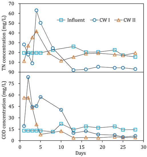 Previous studies [16] had indicated that about 20.1% of the reeds straw could have been decomposed in the first 21 days. Therefore, it was very important to reveal the release pattern of the organic and the nitrogen from the reeds straw in the CWs, as the release pattern was obviously of great significance in guiding the engineering practice. The results of the first stage regarding the concentration of TN and COD in the effluent of each CW are depicted in Figure 2.