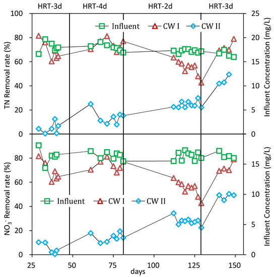 Generally, many pathways contributed to the nitrogen removal in CW, including volatilization, ammonification, nitrification/denitrification, plant uptake, and matrix adsorption [18]. In the case of possessing adequate carbon sources, denitrification was the main contribution. In order to confirm the optimal HRT for TN removal, a series of HRT (two, three, and four days) were selected for confirmation in the second stage and the results are depicted in Figure 3. It showed that the TN and NO3− removal efficiencies in CW I were 64.3 ± 5%, 74.1 ± 6%, and 53.0 ± 5%, and 81.0 ± 9%, 87.4 ± 6%, and 62.1 ± 2% under an HRT of three, four, and two days, respectively. Correspondingly, the efficiencies in CW II were 14.4 ± 3%, 14.4 ± 3%, and 24.0 ± 3%, and 14.4 ± 4%, 14.4 ± 4%, and 26.8 ± 4%, respectively. Obviously, the removal efficiencies of TN and NO3− had increased with the prolonged HRT. Moreover, the CW II without reeds straw filled had achieved a poor performance compared with the CW I, regardless of the HRT condition. Obviously, the TN removal efficiency was restrained by the insufficient carbon source that was needed to fuel the denitrification. By the contrast, CW I benefited from the reeds straw that was filled inside, which supplied the carbon source.
