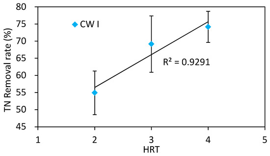 In order to make the results more cogent, the HRT and the nitrogen removal efficiency were correlated by the analysis of regression, as depicted in Figure 4. The R2 was as high as 0.93, which demonstrated a significantly positive correlation in CW II. It meant, for CW II, that the HRT of four days was the optimal condition for achieving satisfying TN removal. Based on the trend in Figure 4, the TN removal performance would be improved further by increasing the HRT for longer. However, this would sacrifice the high flow rate or it would lessen the land footprint that was needed to build the CW. Thus, proper HRT should be selected in the full-scale application.