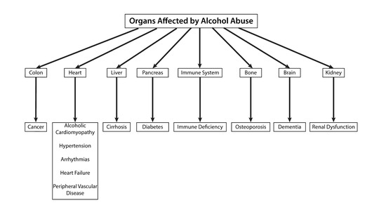 Alcohol abuse can affect more than the heart and the liver. Many observers often do not appreciate the complex and differing aspects of alcohol’s effects in pathophysiologies that have been reported in multiple organs. Chronic alcohol abuse is known to be associated with pathophysiological changes that often result in life-threatening clinical outcomes, e.g., breast and colon cancer, pancreatic disease, cirrhosis of the liver, diabetes, osteoporosis, arthritis, kidney disease, immune system dysfunction, hypertension, coronary artery disease, cardiomyopathy, and can be as far-reaching as to cause central nervous system disorders. In this review article, we will discuss the various organs impacted by alcohol abuse. The lack of clear guidelines on the amount and frequency of alcohol intake, complicated by personal demographics, make extrapolations to real-life practices at best difficult for public health policy-makers.