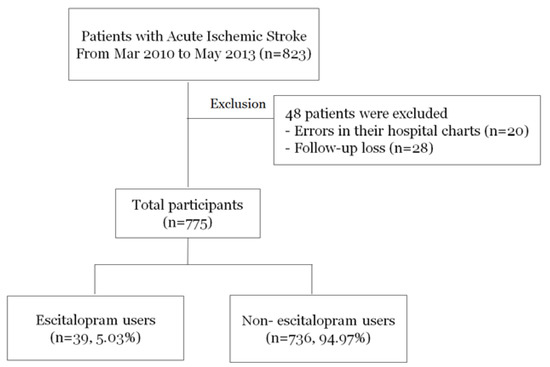 Physicians, however, often overlook the potential positive effects of antidepressants. Compared with Western countries, antidepressant prescriptions are especially uncommon in Korea [14]. This study, therefore, aims to identify the factors that lead to antidepressant prescription among the subjects with acute ischemic stroke (AIS) in clinical practice. Escitalopram is a selective serotonin reuptake inhibitor (SSRI) with few drug interactions, and is thus suitable for stroke patients who are prescribed multiple medications [15]. To achieve this goal, this study examined the predictors for escitalopram prescriptions and effects of escitalopram on short-term functional outcomes in patients with acute ischemic stroke (AIS).
