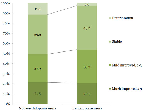 The mean age of the 775 participants was 66.8 ± 12.9 years, and 38.8% were women. The baseline demographic and clinical characteristics are shown in Table 1. Exactly 39 patients (5.03%) were classified as escitalopram users. Escitalopram users were relatively older and more frequently classified as having a cardioembolic subtype of stroke etiology than non-escitalopram users. Escitalopram users more frequently had dysphagia, tube feeding at 3 days after stroke onset, longer hospitalizations, more frequent ICU stays, longer ICU stays, more severe neurological severities, and were more to have mechanical ventilation and history of infection during the admission period. Escitalopram users were less likely to show neurological deterioration (2.6%) than non-escitalopram users (11.4%). However, this difference was not significant in terms of the change in neurological severity (Figure 2).