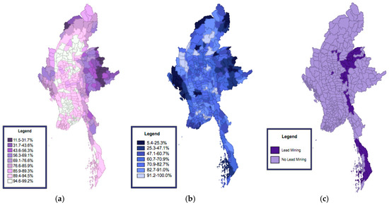 Descriptive maps of Myanmar visually representing adult literacy levels (a), access to safe sanitation (b), and lead mining activity status (c). Both access to safe sanitation and adult literacy levels were mapped using natural breaks calculated through GeoDa, while the lead mining map represents dichotomous variables.