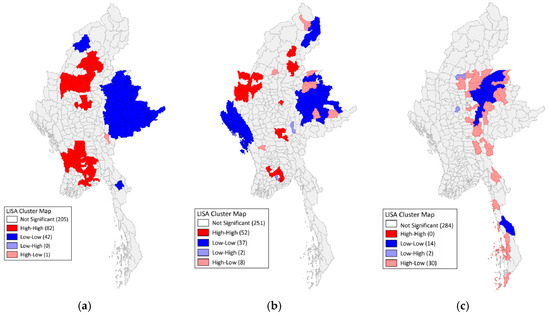(a) Local Indicators of Spatial Association (LISA) Cluster Map of Adult Literacy at the Geographic Level of Myanmar Townships. (b) LISA Cluster Map of Access to Safe Sanitation at the Geographic Level of Myanmar Townships. (c) LISA Cluster Map of Lead Mining at the Geographic Level of Myanmar Townships.