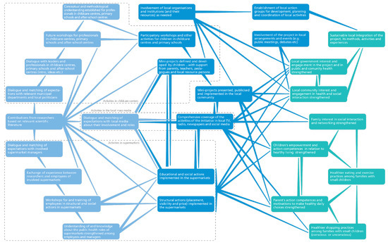 To ensure coordination and integration of activities across settings and communities, common overall themes were selected and addressed based on the ideas and interests of the local partners and by the focus of the project. Hence, activities varied from setting to setting, and also from community to community, depending on the motivation and ideas of the stakeholders in different settings/communities, but were simultaneously implemented within the same overall theme both in supermarkets, childcare centres, and/or schools and mass media.