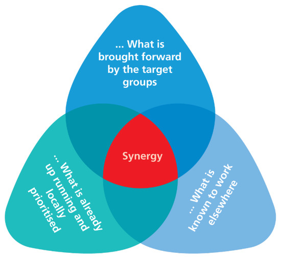 By consistently using participatory approaches to engage with children, families, and professional stakeholders of the local community, their insights and aspirations for social action and health promotion were expected to influence and inform the development of specific intervention components. At the same time, it was prioritized that the intervention should be based on existing scientific evidence. Thus, as illustrated in Figure 3, the development of the activities was based on three sources of inspiration: (1) the perceived needs and ideas of target groups and professional stakeholders; (2) the wider priorities and development agendas of the local communities; and (3) the evidence-based knowledge and experience of the researchers. By consistently using all three sources of inspiration in interactive processes among project stakeholders and target groups, it was possible to create synergy and optimal opportunities to obtain effects and sustainability of the interventions. The researchers contributed with theory and evidence-based knowledge on what has worked (or did not work) in similar settings elsewhere. Moreover, the citizens and professional stakeholders contributed with knowledge and experience on what might be socially, culturally and financially acceptable, as well as knowledge about local development priorities, ongoing initiatives, resources, and willingness to explore local change potentials for strengthened health promotion action.