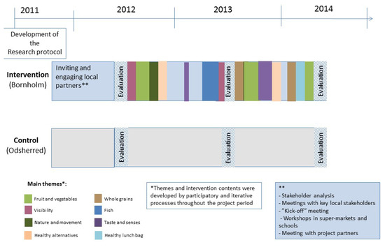 The main target group was families with children enrolled in the participating childcare centres (age range 3–6 years) and primary schools, grade zero to two (age range 6–8 years). Approximately 440 and 420 children were eligible to participate in the three local communities on Bornholm and in Odsherred, respectively.