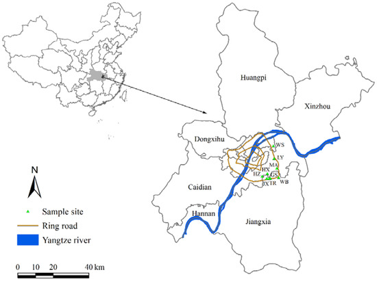 Map of the study area with sampling sites in the urban area of Wuhan.