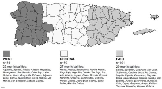 Ethno-geographic distribution of the total samples collected for the study. Sampling strategy was population-based and stratified-by-region, according to the 2004 National Registry of Births in the Commonwealth of Puerto Rico. n Indicates the number of samples collected per region. In parentheses, the number of municipalities from each region of the Island of Puerto Rico where at least one of the collected samples came from is indicated (i.e., 77 out of 78 municipalities are represented).