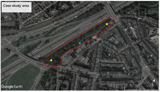 The investigated cycling path goes across the urban green area inside the red dashed line, bordering the ring road. The yellow dots represent the survey positions, at the end of the cycling path; the blue dot represents the microphone position.
