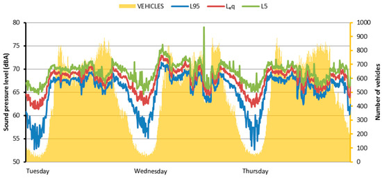 Figure 3 shows an example of three days of monitoring during the survey period, representing both sound levels and vehicle counts. The correspondence between the daily patterns of the two datasets is clearly visible. Traffic saturation on the Ring Road is also noticeable: noise levels decrease during the intervals with highest traffic intensity, due to the consequent reduced speed of the vehicles. Furthermore, in Figure 4 it is possible to observe the exponential associations between the equivalent and statistical sound levels along the cycling path and the number of vehicles in transit on the Ring’s section. Going from the background levels (L95) to the peak levels (L5) the association with the number of vehicles becomes weaker. However, the number of vehicles accounts for more than 77% of variability in L95 values. Therefore, vehicles’ count and noise levels data confirm that the sound environment of the investigated green area is dominated by road traffic noise [42].