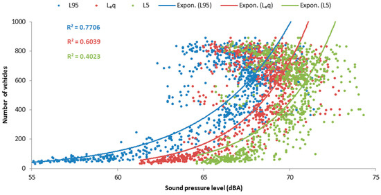 Exponential associations between sound levels and number of vehicles (on 5-min intervals).