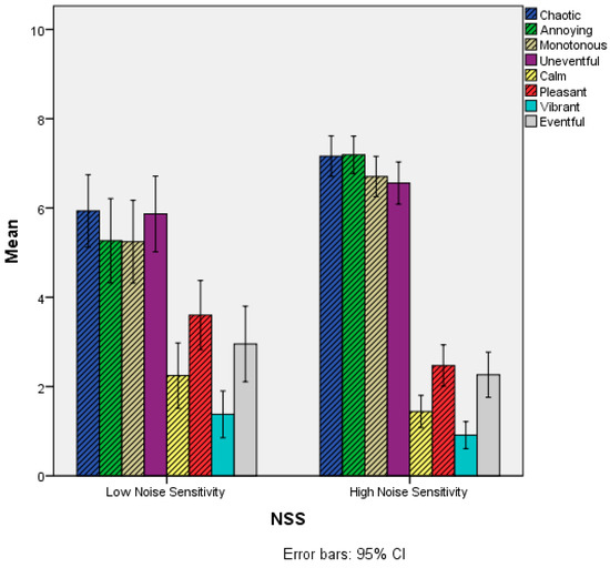 Mean scores of the Soundscape appraisal items as a function of the NSS variable. Grey-shaded bars refer to items where statistically significant differences were observed between the two groups. NSS: Noise Sensitivity Scale.