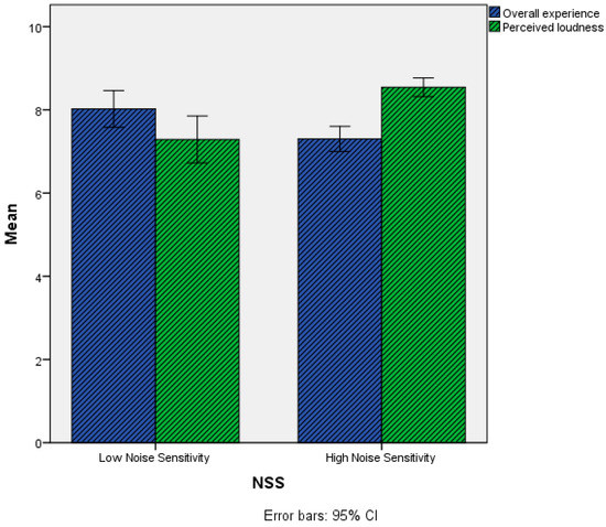 For the Perceived loudness item the Low Noise Sensitivity (M = 7.29, SD = 1.88) group had statistically significantly lower scores than the High Noise Sensitivity group (M = 8.54, SD = 1.32). Contrariwise, for the Overall experience item the Low Noise Sensitivity (M = 8.02, SD = 1.47) group had statistically significantly higher scores than the High Noise Sensitivity group (M = 7.30, SD = 1.79). Mean scores for these two items are reported in Figure 6 and Table 3.