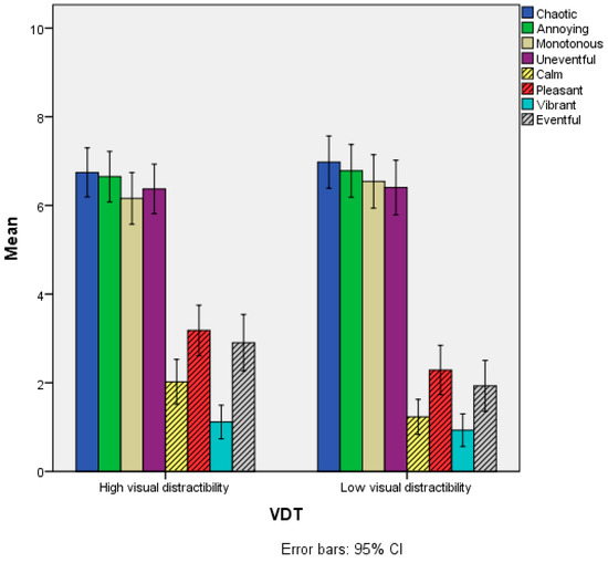 Mean scores of the Soundscape appraisal items as a function of the VDT variable. Grey-shaded bars refer to items where statistically significant differences were observed between the two groups.
