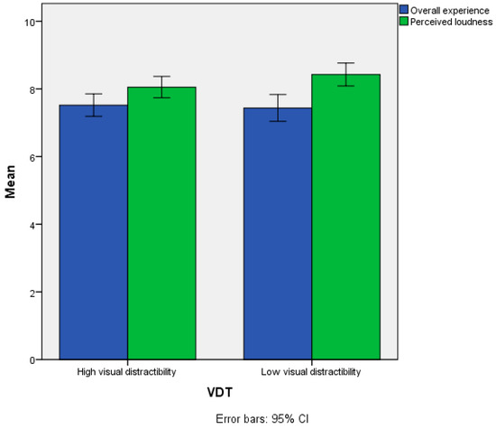 For the Perceived loudness and Overall experience, no statistically significant differences (p > 0.05) were observed between the two VDT groups. Mean scores for these two items are reported in Figure 8 and Table 4.