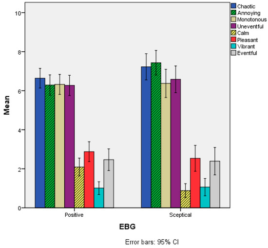 Regarding the Soundscape attributes, statistically significant differences emerged only for the items Annoying and Calm. For Annoying, the scores of the Positive group (M = 6.29, SD = 2.81) were lower than the Sceptical group (M = 7.43, SD = 2.59). Conversely, for the Calm item, the scores of the Positive group (M = 2.09, SD = 2.47) were higher than the Sceptical group (M = 0.88, SD = 1.46), as reported in Figure 9. No statistically significant differences (p > 0.05) were observed between the two EBG groups for the other Soundscape appraisal items.