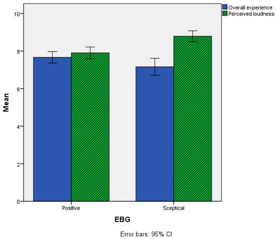 For the Perceived loudness item the Positive (M = 7.90, SD = 1.68) group had statistically significantly lower scores than the Sceptical group (M = 8.79, SD = 1.19), but the difference in terms of Overall experience was not statistically significant between the EBG groups, as reported in Figure 10 and Table 5.