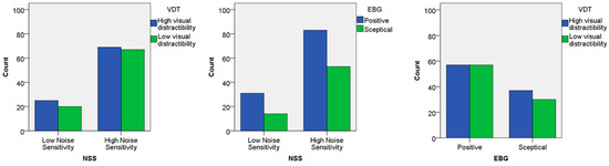 Bar charts representing the number of participants, sorted according to the groups of the three person-related variables (NSS*VDT, NSS*EBG, and EBG*VDT).