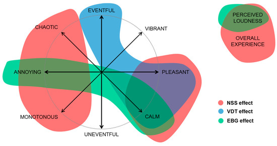 Schematic representation of the effects of personal factors (NSS, VDT and EBG variables) on Soundscape appraisal (depicted according to the “circumplex” model [37]), Perceived loudness and Overall experience.