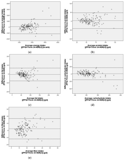 Bland–Altman plots showing the agreement with respect to (a) energy, (b) protein, (c) fat, (d) carbohydrate and (e) fiber intakes assessed using a short FFQ and 24-HDRs in type 2 diabetes patients in Taiwan. Solid lines indicate the mean of the differences, and the dashed lines indicate the lower and upper 95% limits of agreement.