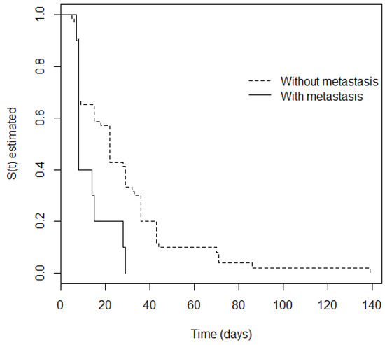The non-parametric Kaplan-Meier estimator was initially used and showed an estimated mean time of 30.6 days until remission of mucositis. The log-rank and Peto tests were used to establish whether there was a difference in time for regression of mucositis for each variable. Table 2 shows that only the “Metastasis” variable was considered significant (p < 0.10); i.e., there was a difference in mucositis regression time between patients with metastasis and those who did not have it. Figure 1 shows the stratified survival curve for the metastasis variable, showing a significant p-value.