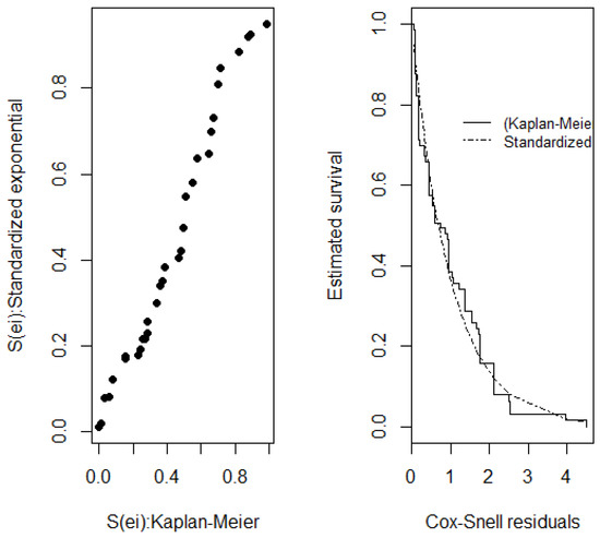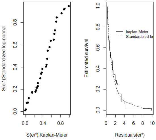 Parametric tests were used to estimate the survival data more accurately. The exponential, log-normal and Weibull distribution models were applied. Graphical tests were used for the choice of model fit method to be used, followed by administration of the maximum likelihood test. The following results were obtained: exponential p = 2.6020 × 10−6; Weibull p = 1.2255 × 10−5; and log-normal p = 0.0187. The exponential and Weibull values were below the prescribed p-value of 0.01; thus, the null hypothesis of this model fit method was rejected. However, the log-normal value did not result in hypothesis H0 being rejected and was, therefore, used for modeling survival.