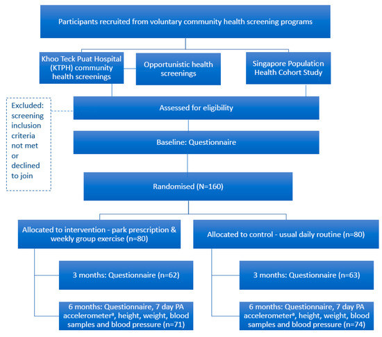 The prevalence of adequate physical activity engagement according to international guidelines is 76.7% globally and 85.2% in South-East Asia [7]. The population-based 2012 Singapore Health study found that 73.8% of all adults and 70% of adults aged 40–59 years performed sufficient total physical activity [8]. Yet, the same Singaporean study and a separate Taiwanese study found that middle-aged people living in these countries exercise the least [8,9]. Community health screening programs for residents over the age of 40 are freely available throughout Singapore. Results of these screenings have showed that a large proportion of this population is not sufficiently physically active. Therefore, these community health screenings present an opportunity to promote physical activity to this portion of the Singaporean population. Reviews have identified evidence of health benefits associated with exposure to parks and other green space including improved mental health, reduced prevalence of type II diabetes and reduced mortality [10,11,12]. Since most of the available research is from cross-section studies which only provide evidence of associations, it is not possible to infer causal relationships between exposure to parks and health outcomes. A systematic review of the impact of interventions to promote physical activity in urban green space concluded that they appear promising but ‘robust evaluations of such interventions are urgently required’ [13]. Consequently, a need exists to implement stronger studies which support causal arguments for exposure to parks improving health.