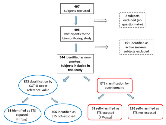 Based on the COT-U value of 1.78 µg/L, 38 (11%) individuals were identified as ETS exposed (ETSCOT) and 306 (89%) as not-ETS exposed (Figure 1). Their median COT-U levels were 3.63 (1.8–17.39) and 0.40 (<0.1–1.32) µg/L, respectively (p < 0.001). No difference in terms of age, gender, and education was found between ETSCOT and not-ETS exposed subjects (Table 1). In ETSCOT subjects, ETS duration was significantly longer than in not-ETS exposed subjects (3 vs. 1 h/day, 18 vs. 6 h/week, and 6 vs. 4 day/week, respectively).